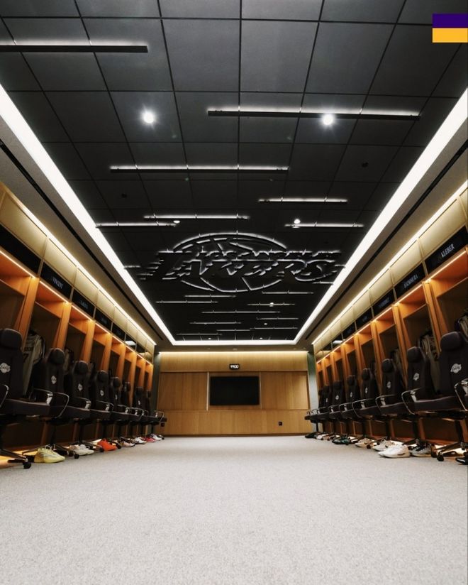 赛前,湖人官方晒出了全新更衣室的图集,今夏球队做出了全面升级,现在屋顶上有一个大的湖人logo,球员们的椅子也都换了。